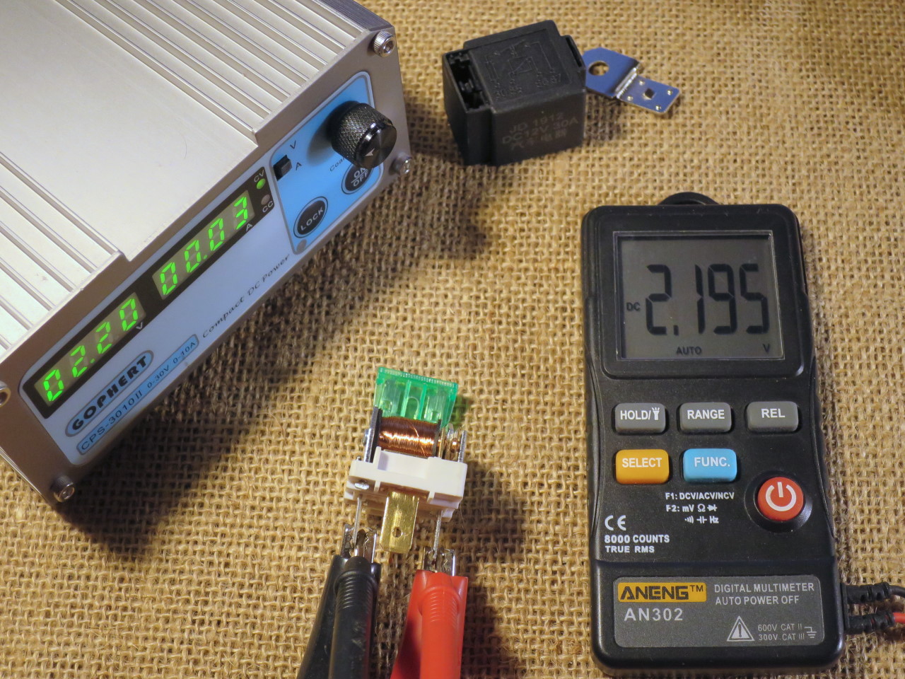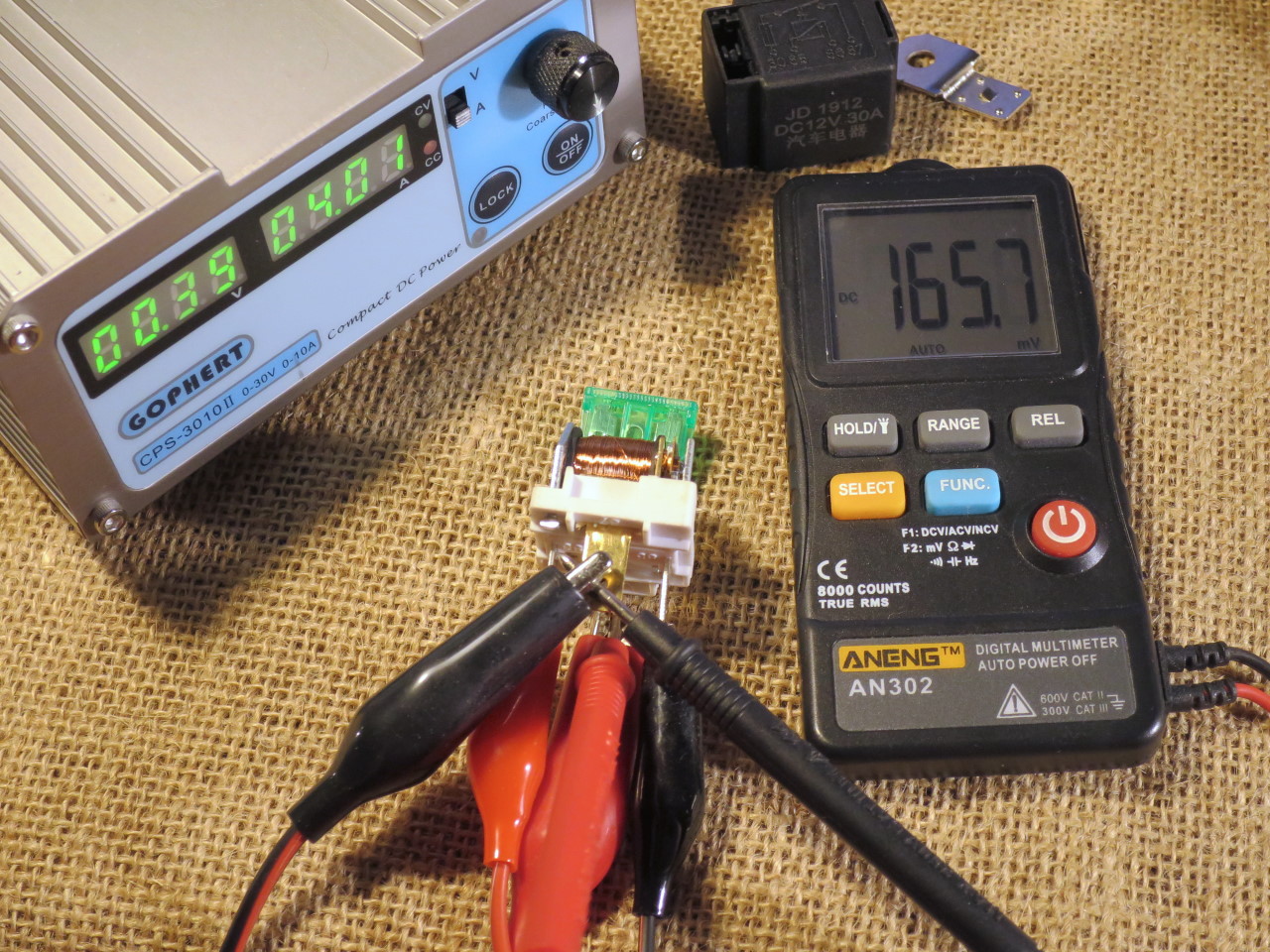 Падение напряжения на контактах — 165 мВ при токе в 4А. Получается 0,04 Ома. Это уже включая предохранитель.