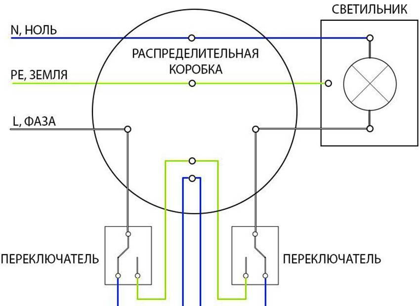 Иногда нужно включать несколько осветительных устройств из разных мест. Для сборки этой схемы нужно подготовить два 2-х клавишных проходных выключателя. Их подключают 2-мя 2-х жильными проводами.