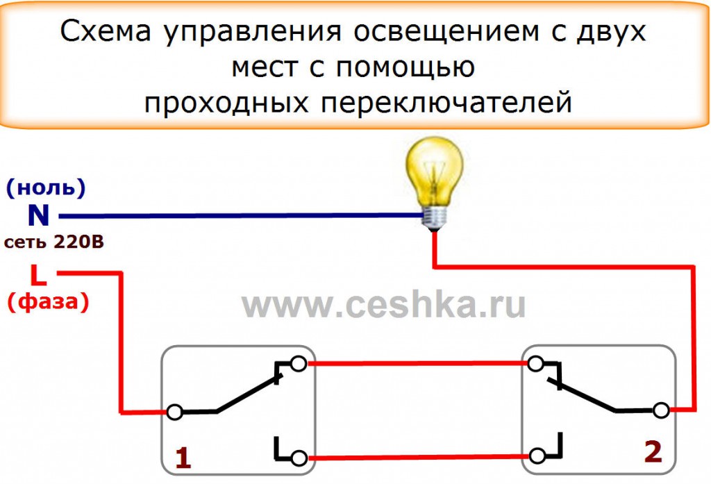 Вот типовая схема управления освещением с двух мест с помощью проходных переключателей: