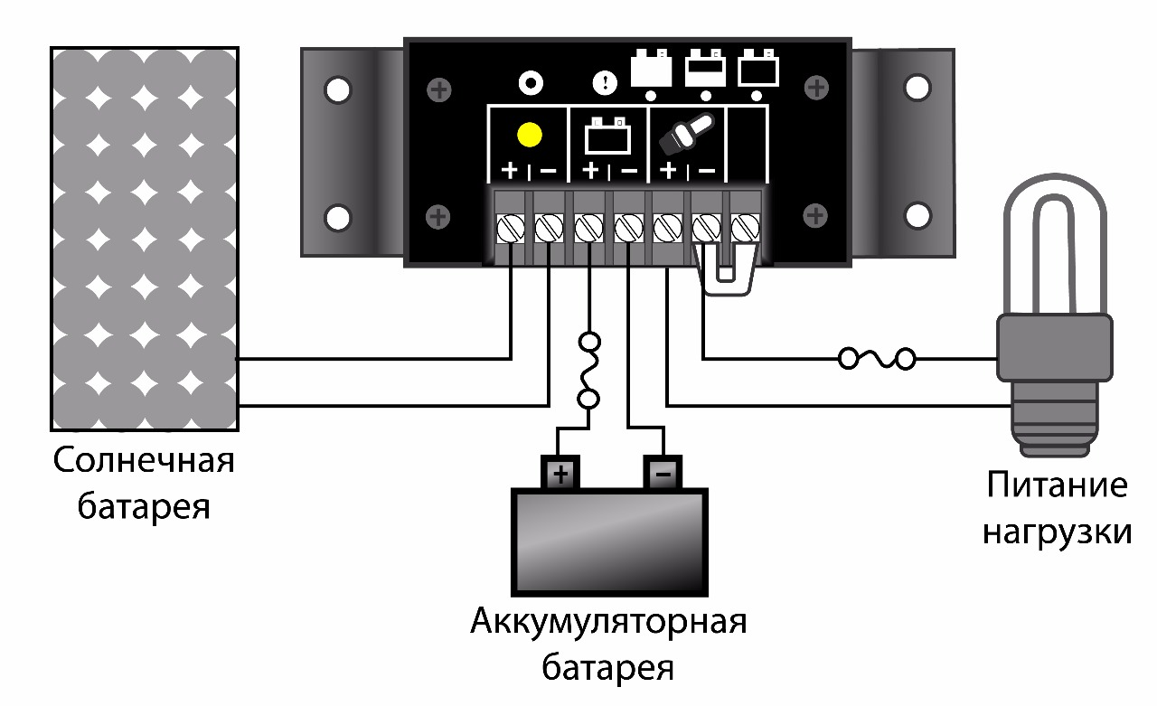 Контроллер представляет собой устройство, которое помещается между солнечной панелью и аккумулятором. Он регулирует напряжение и ток, приходящий от солнечных панелей для поддержания надлежащего качества зарядки аккумуляторных батарей.