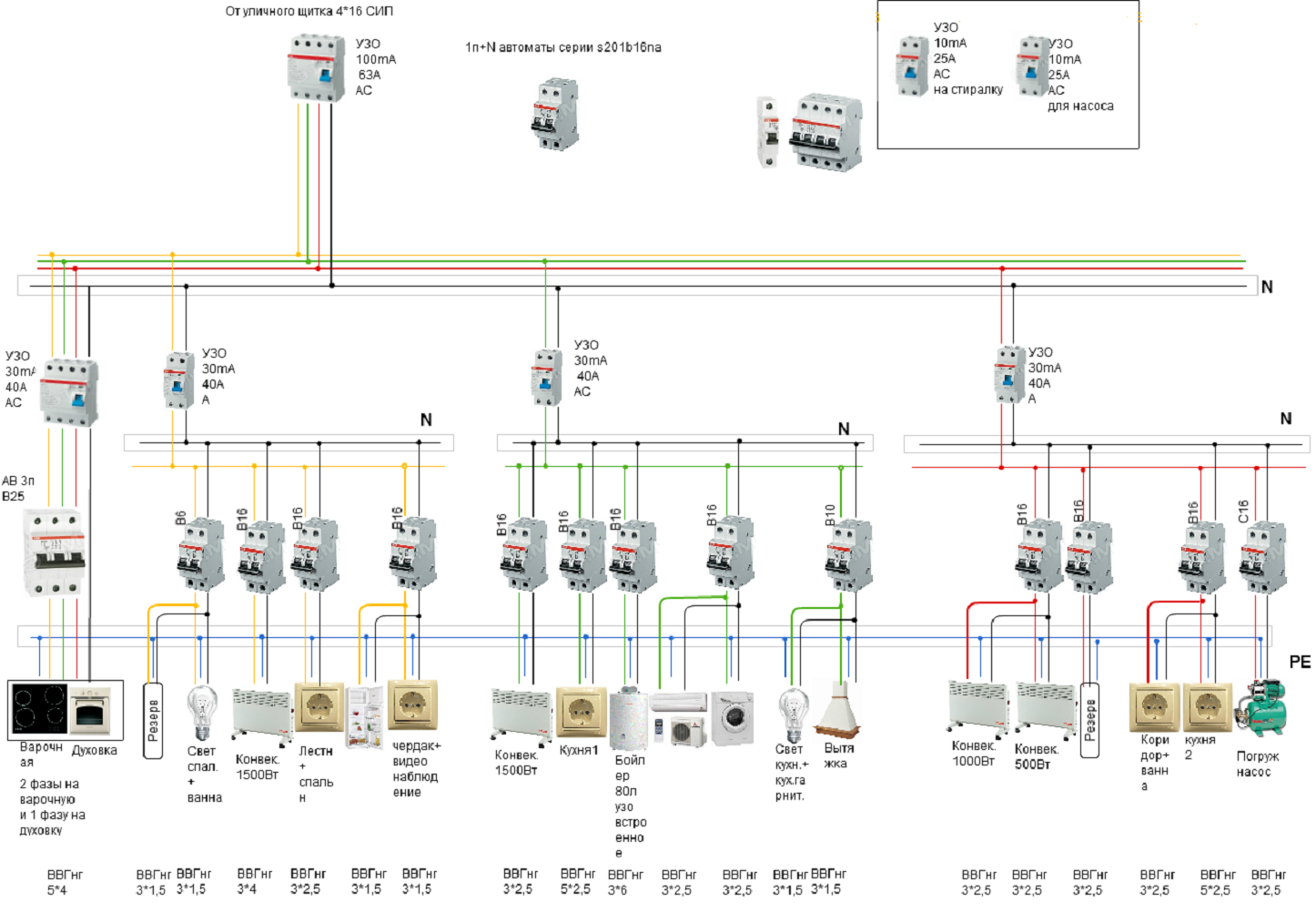 Дополнительная сложность составления схемы электропроводки заключается в сопоставлении ее рабочих параметров с мощностью приборов. Поэтому заранее нужно знать, что и где будет стоять, и какие нагрузки на сеть будет оказывать.