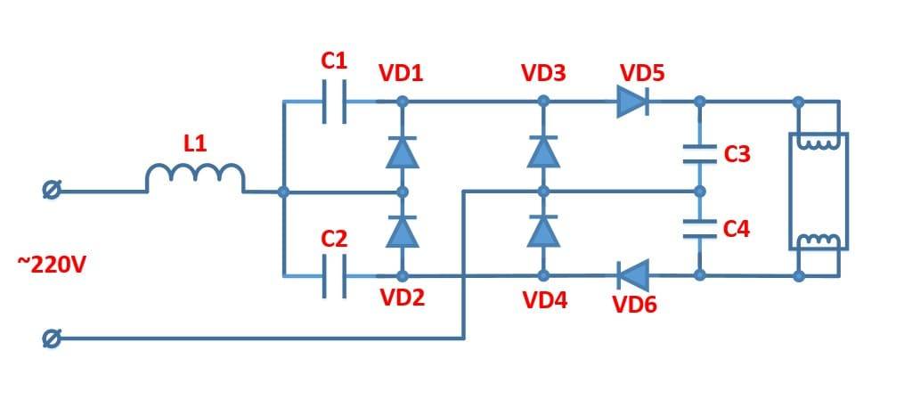 Умножитель напряжения состоит из включённых по определённой схеме диодов и конденсаторов и представляет собой преобразователь напряжения переменного тока низковольтного источника в высокое напряжение постоянного тока. Схема подключения люминесцентной лампы через умножитель выглядит так: