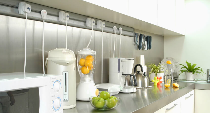 - Можно располагать розетки внутри шкафчиков, под рабочей столешницей. Для этого сзади в мебельных стенках проделывают отверстия для коммутационных аппаратов. Это сэкономит место и не нарушит общий вид.