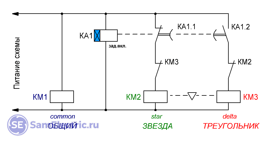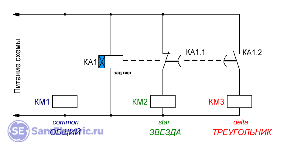 Что такое КМ1, КМ2, КМ3, вы уже знаете, а вот КА1 – это реле времени с задержкой при включении. Реле может быть любым, хоть электронным, хоть пневматическим типа ПВЛ. Главное, чтобы контакты переключались из исходного состояния через время задержки после подачи питания на КА1.