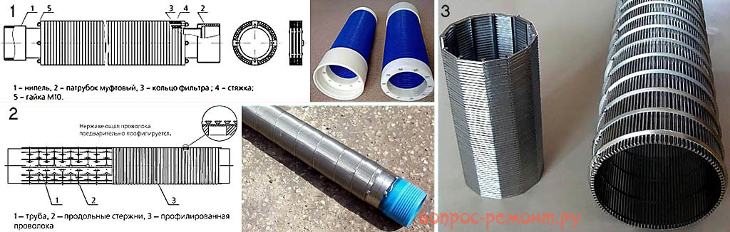 - Безопорные сварные фильтры, проволочные и щелевые. Были бы идеальными (последние выдерживают и осадку в ствол снаружи на трубе), если бы не цена: делаются из той самой профилированной нержавеющей проволоки, что стоит примерно как серебро.