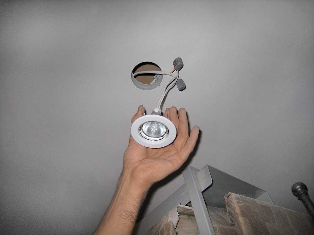 - Провода вытаскивают и подсоединяют к разъемам, подключают электропитание на распределительном щите, проверяют работу софита, лампы. Если все исправно, снимают прижимные пружины, а софит помещают в отверстие, потом пружины раздвигают и к поверхности потолочного полотна прижимают корпус.