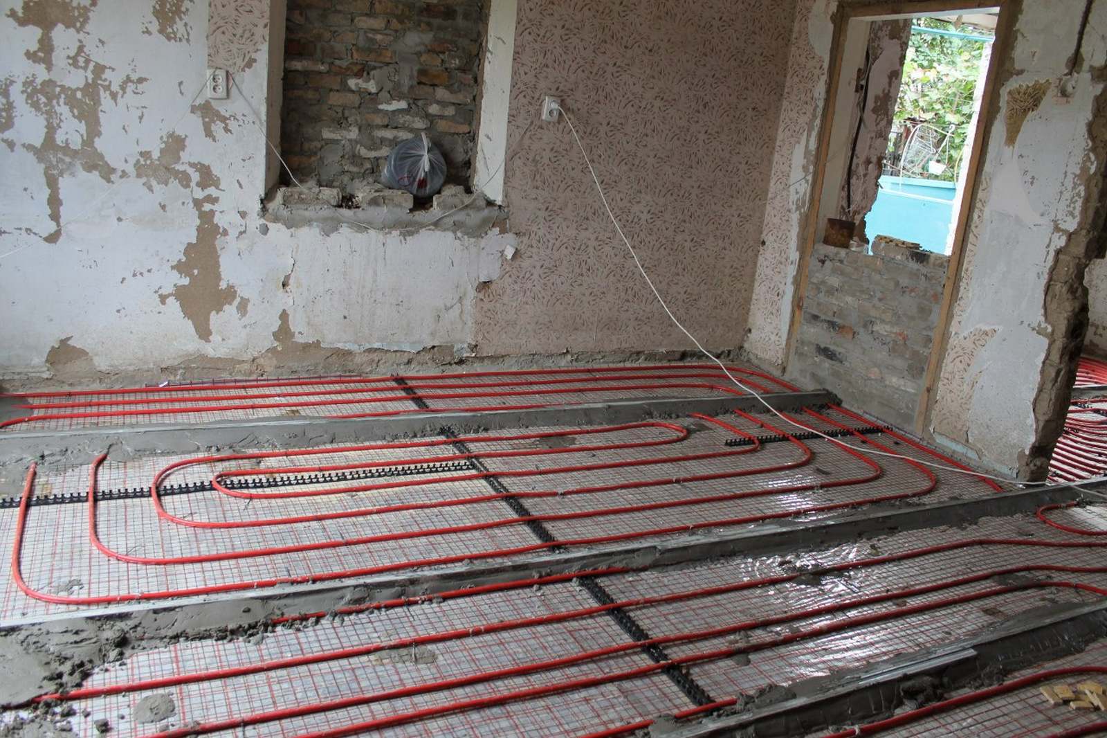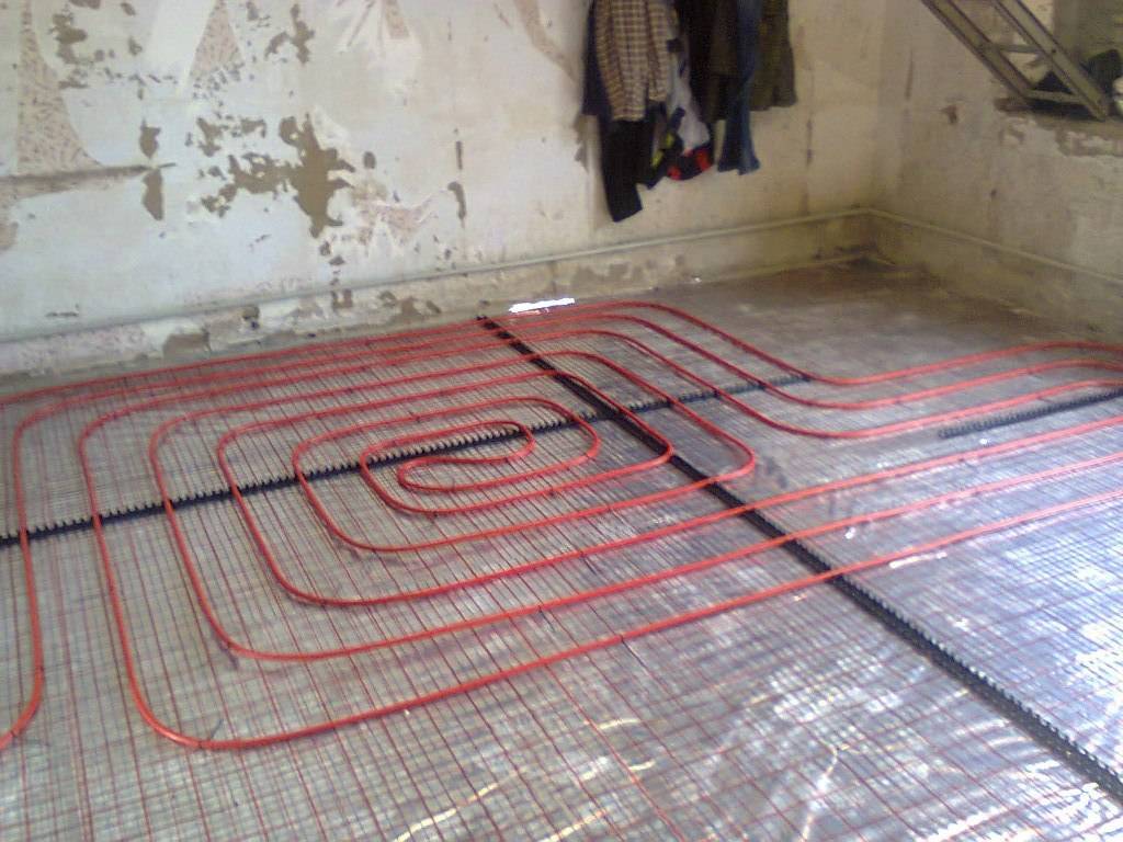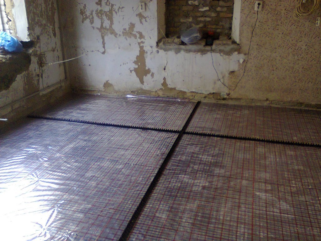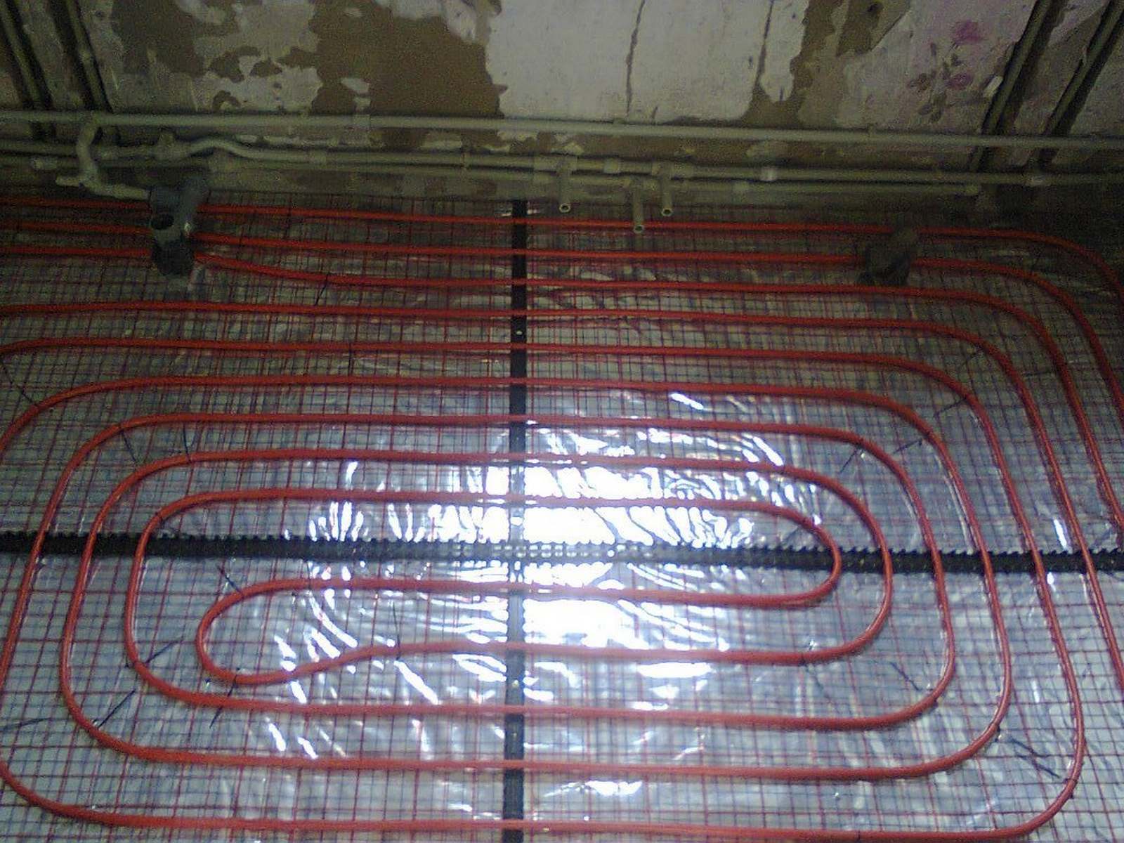 Также армирование будет полезным только в том случае, если армирующая сетка будет не просто лежать поверх системы труб, а «утопать» в растворе, при застывании находясь внутри стяжки.