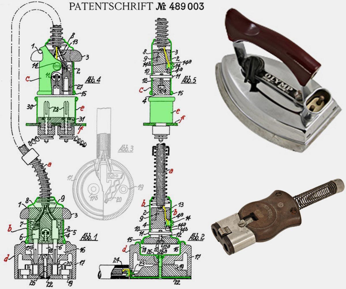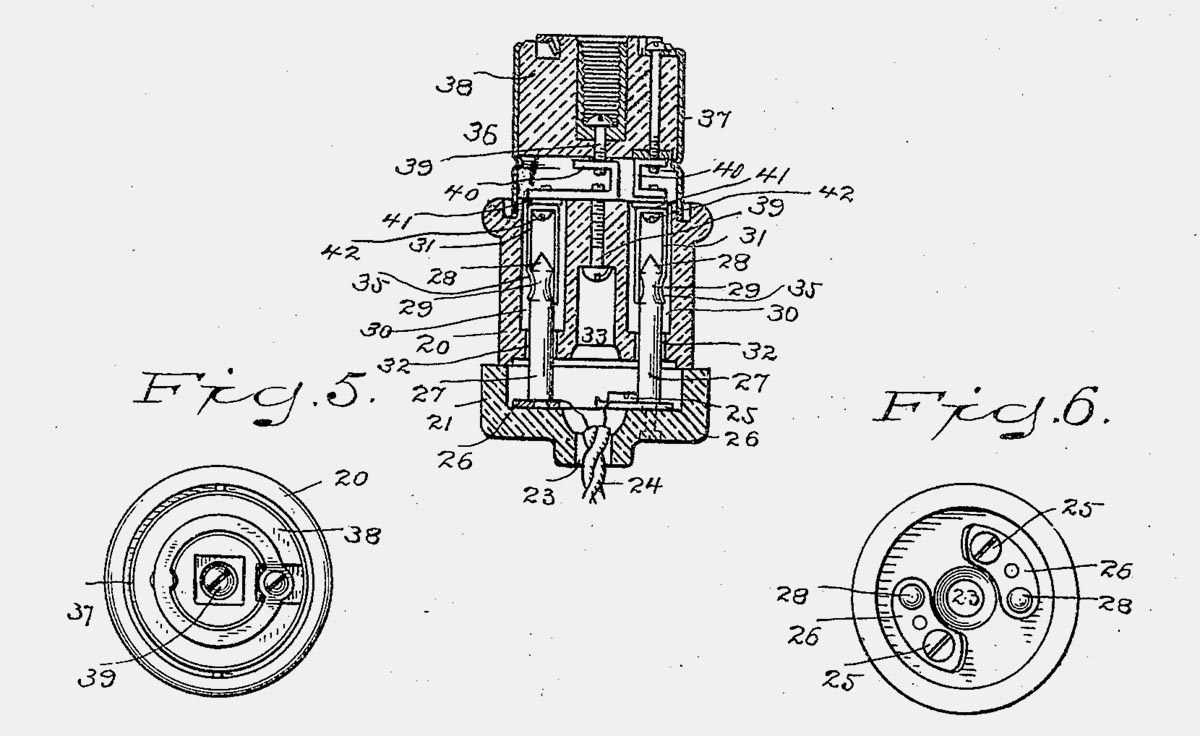 - Патент US776326 A (1904 год) забивает за автором право на разветвитель с основанием в виде цоколя лампы Эдисона, позволяющий одновременно вкручивать лампочку и присоединять рядом бытовые приборы. Второй вариант изобретения предлагает тройник с аналогичным интерфейсом. Вместо лампочки возможно уже включить три прибора. Розетки разветвителя двухштырьковые, наподобие тех, что использовались в СССР. Штыри напоминают джэки из аудиозаписи.