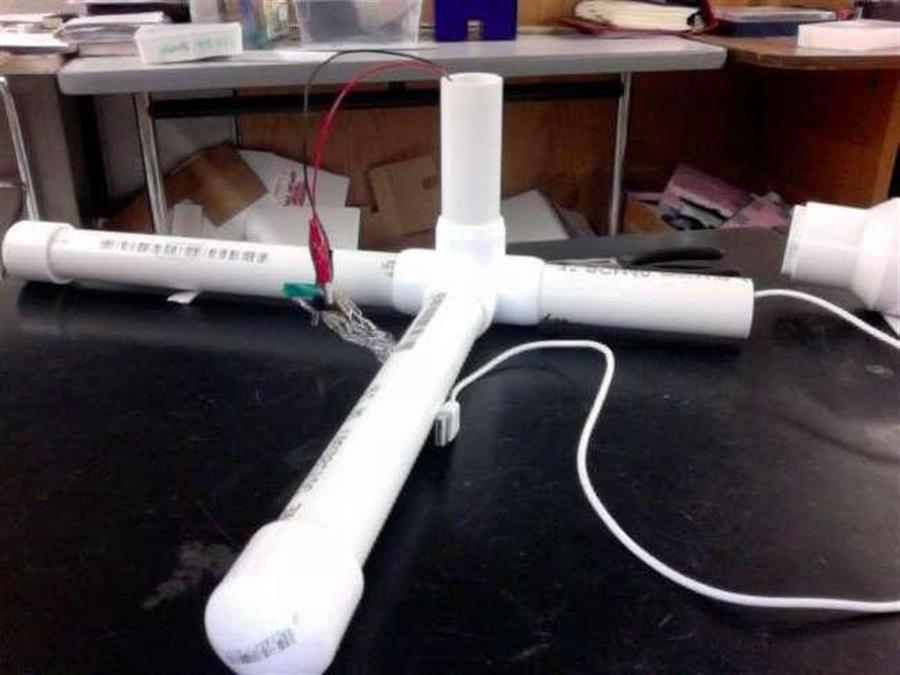 Сделайте несколько таких конструкций, а после того как все будет готово, их можно прикрутить к деревянной основе. Не забудьте вывести и соединить кабели с центральной системой. Готовое изделие можно покрасить в любой цвет так, чтобы оно подходило к интерьеру комнаты. Не забудьте перед этим постелить бумагу, чтобы не испачкать пол. Вкрутите лампу и, щелкнув выключателем, проверьте работоспособность светильника из ПВХ-труб.