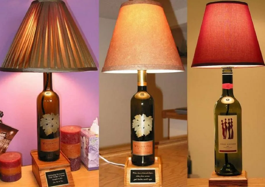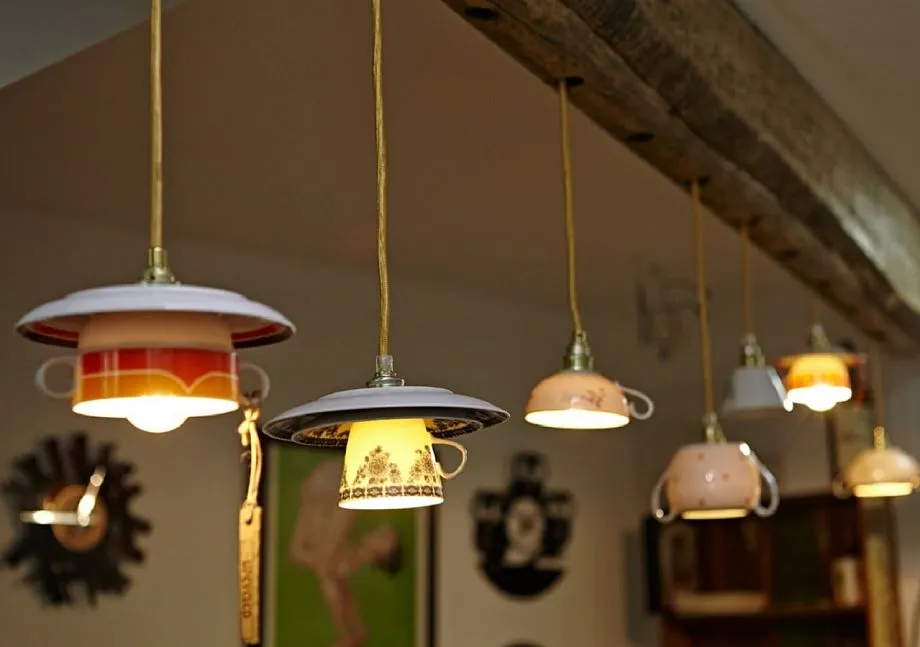 Простенький светильник можно сделать из старой посуды. Бокалы, чашки и вазочки подойдут в качестве плафонов. В дне изделий нужно аккуратно просверлить отверстия, в которые пройдет шнур от патрона. В роли подставки использую стеклянные бутылки, декорированные бечевкой или разноцветным песком.