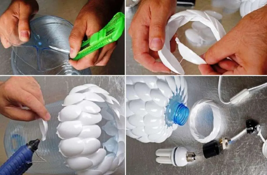 Абажур для светильника можно сделать из пластика. В качестве материала советую использовать как одноразовую посуду, так и старые диски. Роскошную модель в виде цветка легко собрать из оснований ложек или разрезанных бутылок из-под напитков. При помощи горячего клея детали надежно фиксирую на каркасе из пятилитровой баклажки. Патрон с лампой продеваю в горлышко.