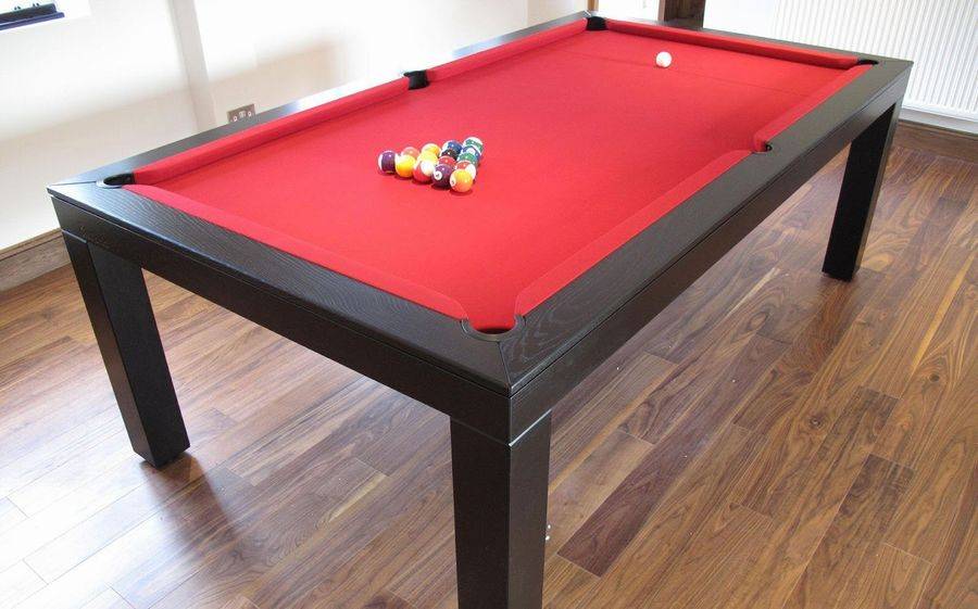 Бильярдный стол изготовлен из дерева покрытого темной краской, столешница покрыта специальным материалом под названием сукна, она здесь использована в красном оттенке.