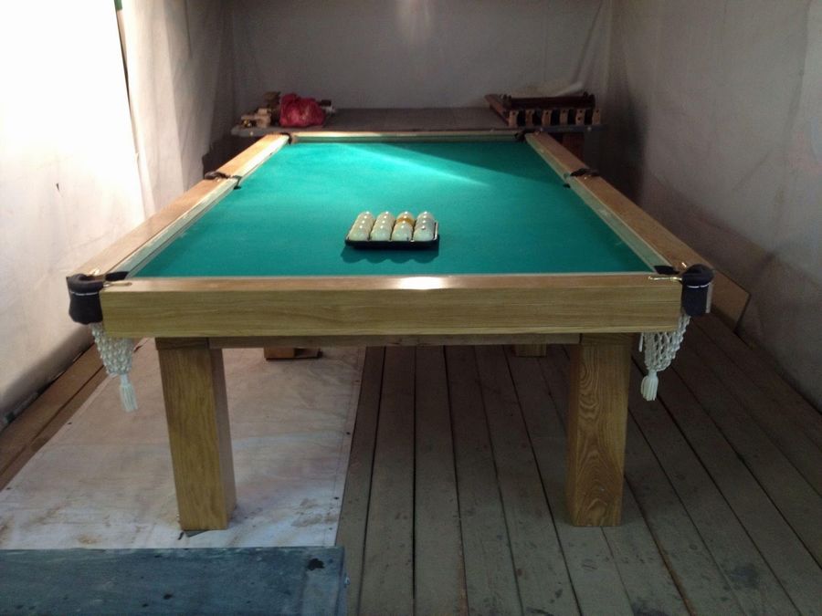 И даже такие проблемные столы, как Вы видите, можно вернуть к жизни, разобрав их полностью и отреставрировав, в редких случаях, можно поменять сукно на новой, но это тогда, когда оно уже порвано или истерлось до белизны.