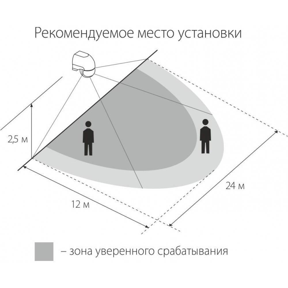 При установке на потолке угол обзора датчика будет составлять 360°, что обеспечит 100% покрытие всей площади помещения. При установке лампы с датчиком движения на стене, угол обзора сокращается до 120-180°.