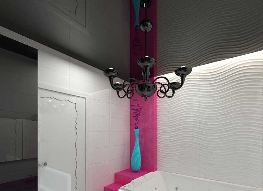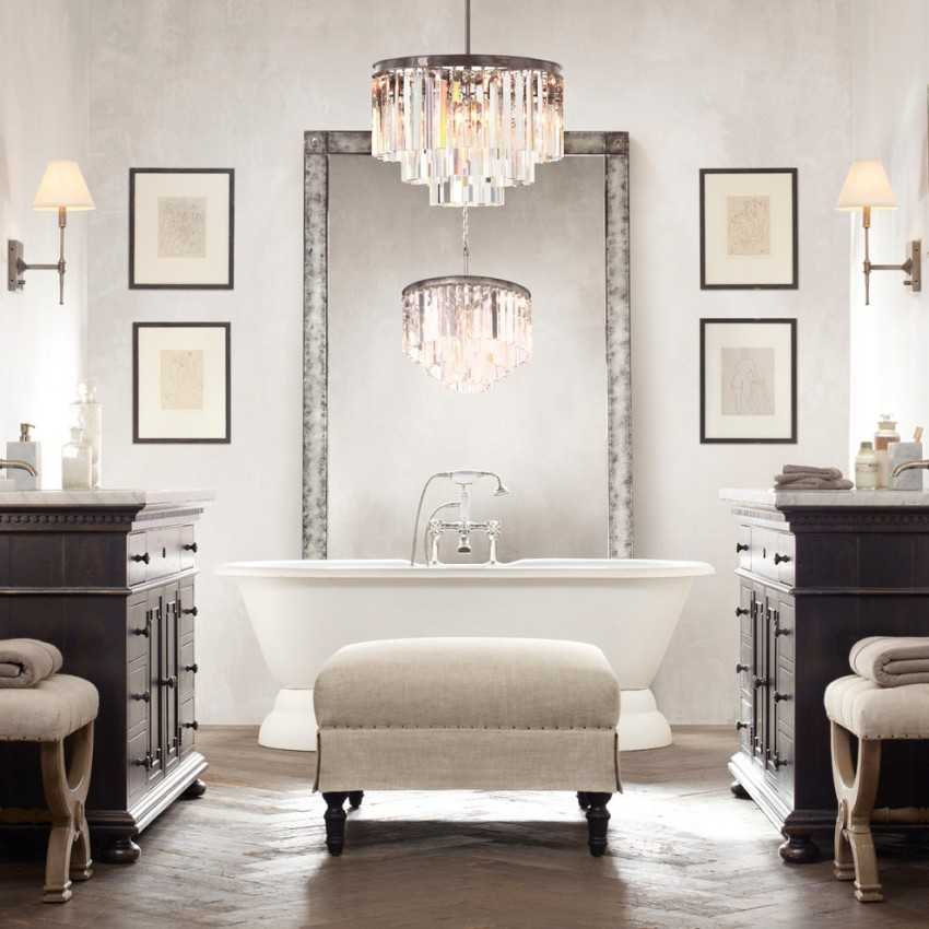 3 — для общего освещения пространства, создания особой атмосферы и реализации дизайнерского решения помещения (при учете, что площадь и высота потолка позволяют) можете смело вешать люстру в ванную комнату. Если она висит на безопасном от воды расстоянии, в помещении работает вентиляция, порадуйте себя желанным светильником в ванной.