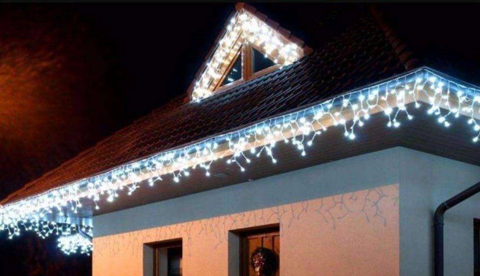 Когда нужно охватить дом по периметру, то потребуется изделие максимальной длины. Необходимо рассчитать периметр здания и делать выбор, исходя из расчетов. Для этого декораторы советуют использовать соединяющиеся провода, в таком случае понадобиться только один источник питания. Стандартная длина у каждого производителя своя. Основные типоразмеры: