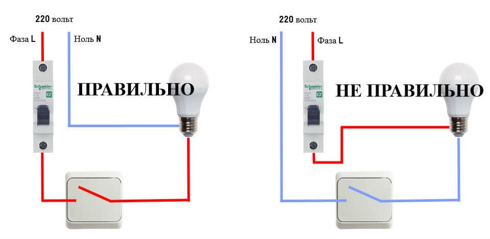 Сам поиск необходимо начинать с проверки правильного подключения фазового провода. Он всегда должен быть подсоединен к одному из контактов выключателя.