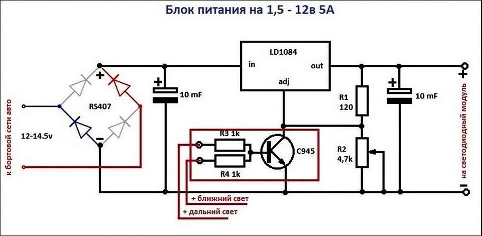 Что понадобится: перфорированная панель для крепления или универсальная печатная плата 35х20 мм, готовая микросхема LD 1084 или LM317, диодный мост RS407 или любой маленький диод для обратного тока, резистор сопротивления, блок питания с транзистором и двумя сопротивлениями. Ниже подробная схема подключения, чтобы ничего не перепутать.