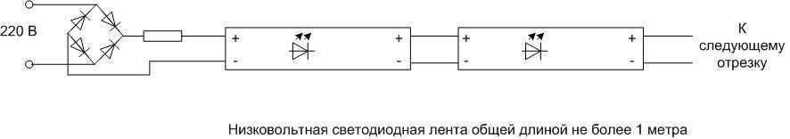 Короткий отрезок ленты, например, для ночника или настольной лампы, можно подключить без понижающего трансформатора, через токограничивающий конденсатор. По похожей схеме собраны недорогие светодиодные лампы.