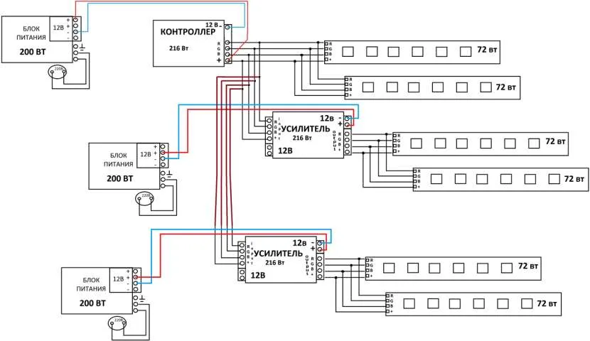 Схема с несколькими БП и RGB-усилителямиИсточник wirenboard.com