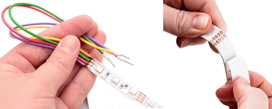 Лента может быть однотонной или . Разделена на равномерные сектора с обозначенными местами разреза и группой светоизлучающих источников на каждом участке. Светодиоды подсоединяются друг к другу последовательным соединением.