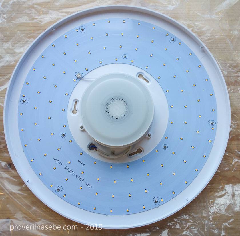 Заявленная цветная подсветка реализована не на всей площади люстры, а только на небольшом ободке вокруг центральной округлой пластинки, прикрывающей динамик.