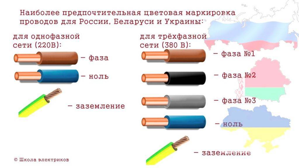 - первая – фаза, это красная, коричневая и белая изоляция;