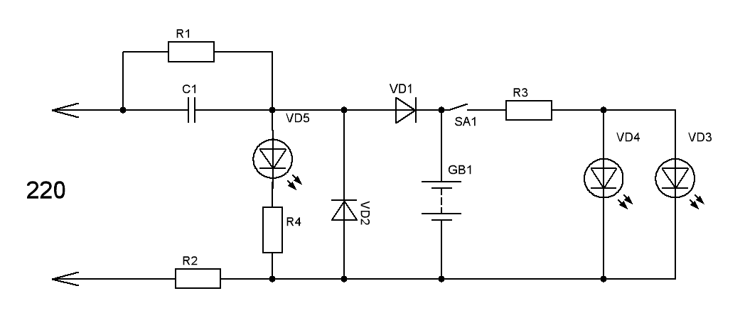 Схема аккумуляторного фонарика с зарядкой от сети 220