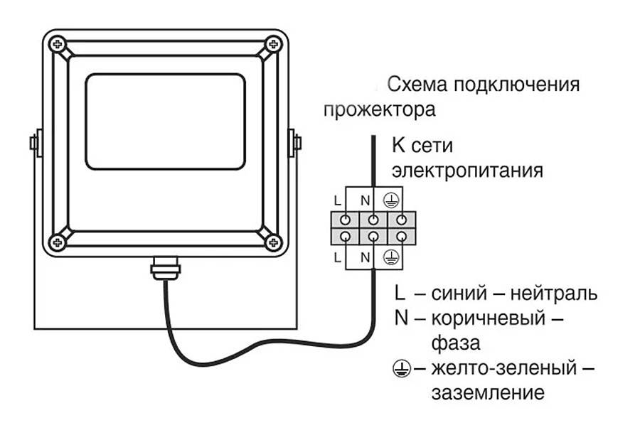 Схема подключения прожектора на базе светодиодов будет разниться в зависимости от элементов цепи, например, если требуется дополнительно установить датчик движения или освещенности. Сам же процесс монтажа источника света данного типа не отличается особыми сложностями.