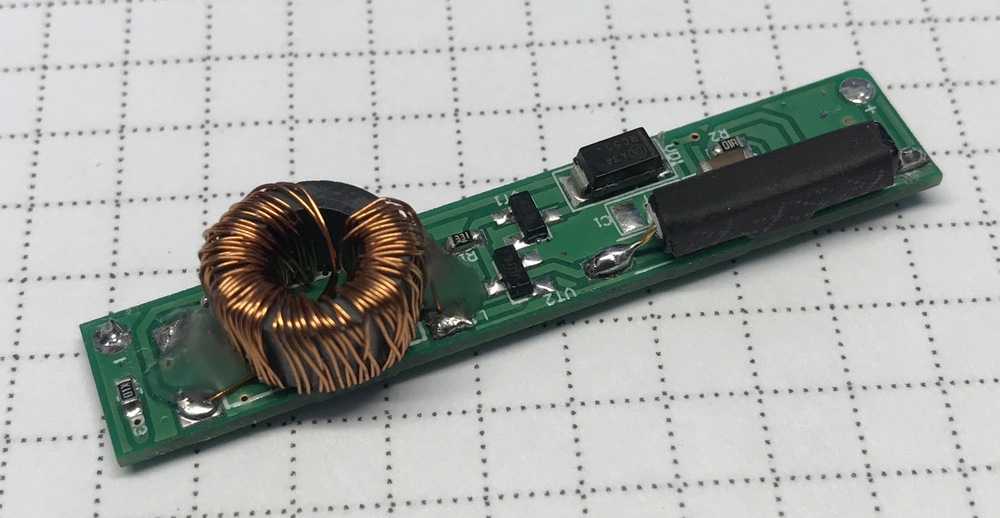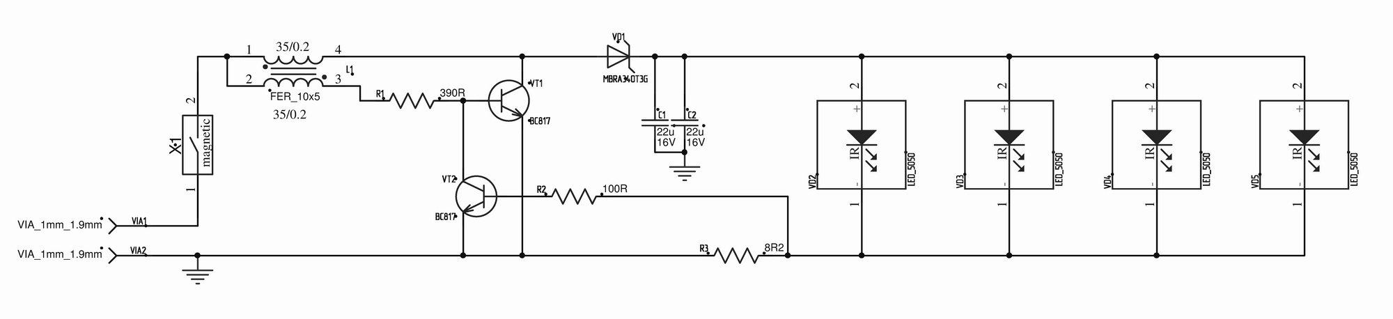 Трансформатор мотается двойным проводом и начало обмоток соединяются как указано на схеме. Чтобы было удобнее, я соединил их на плате. То есть трансформатор подключил всеми четырьмя точками к плате. Получилась вот такая платка, габаритами 48х9мм.