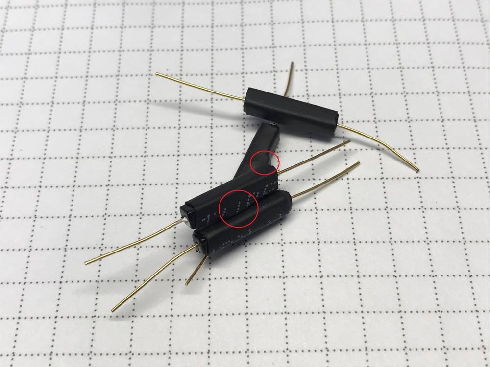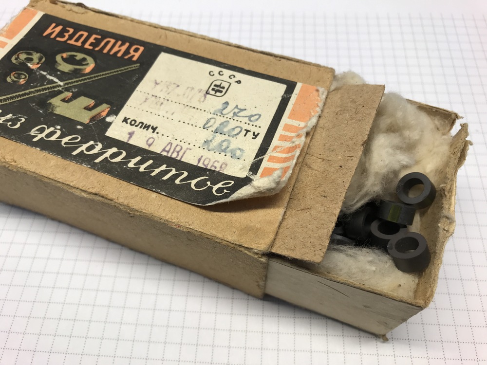 Как я понял под термоусадкой расположен магнит (обвел на картинке), который тянет геркон в состояние N.C. Более мощный магнит может перетягивать его в открытое состояние. Для трансформатора мне понадобились «изделия из ферритов». 1968 год, на минуточку. В вате, 200 шт.