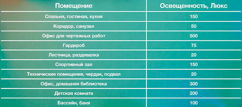 При проектировании освещения дома или офиса специалисты рекомендуют руководствоваться следующей таблицей: