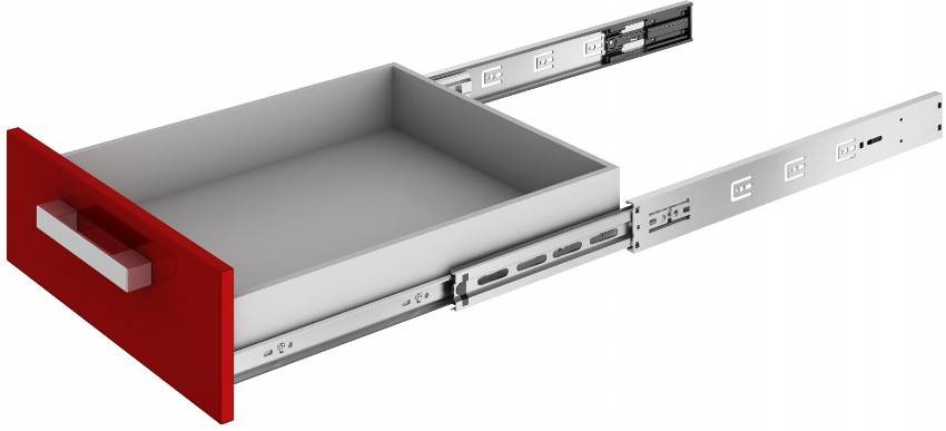 | Конструкции полного выдвижения. Этот тип обеспечивает полный доступ к содержимому выдвижного ящика, что очень удобно. Естественно, надежность системы на порядок выше, чем у первого варианта, так как она должна выдерживать более высокие нагрузки. Чаще всего это многоступенчатая система, так как обеспечить большой ход направляющей с помощью двух узлов невозможно. |
