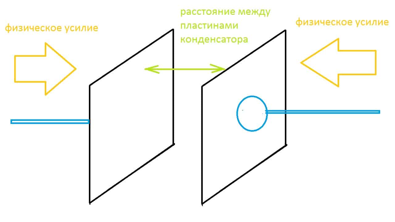 - Емкостные – используют эффект переменного конденсатора, в котором с уменьшением расстояния между пластинами будет возрастать емкость. А при увеличении расстояния или уменьшении площади пластин емкость уменьшится.