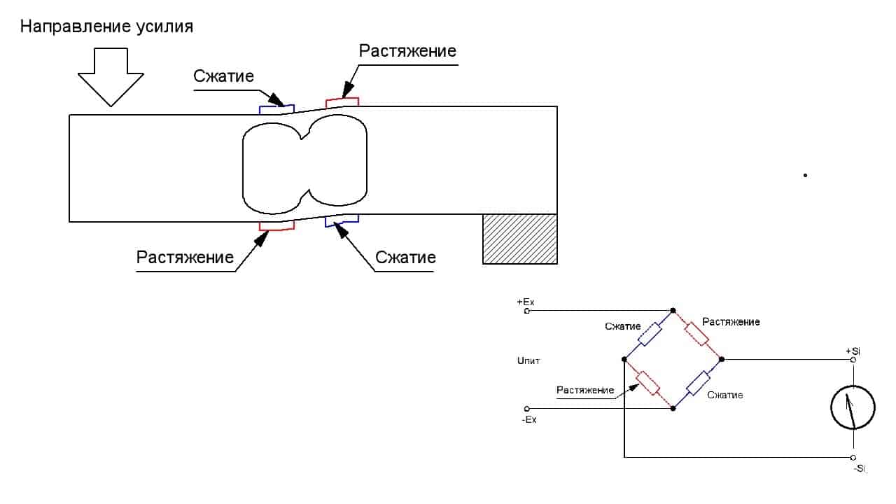 Как только к измерительному органу прибора будет приложена механическая нагрузка, гибкое основание деформируется, от чего изменятся рабочие параметры всех резисторов в цепи моста тензодатчика. В большинстве случаев попарно происходит сжатие и растяжение тензорезисторов (рисунок 3):