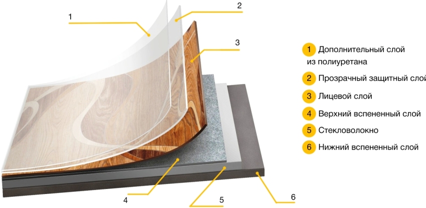 Гомогенный. Однослойный, основы нет. Очень тонкий, вплоть до полутора миллиметров. В быту его стелят в ванные и кухни, сверху кладут защитный слой для повышения износостойкости и улучшения влагозащитных свойств.