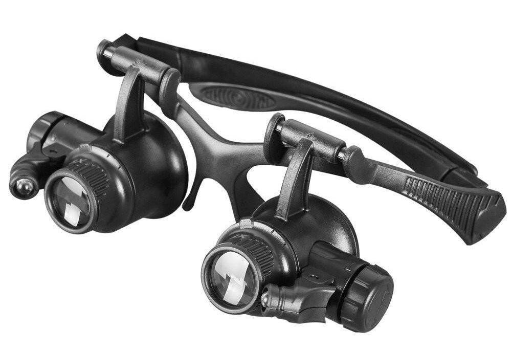 Бинокулярные увеличительные очки-лупа от китайского производителя отличается от предыдущей модели креплением. Оно выполнено в виде очковой оправы, удобно сидящей на ушах. Подходит для длительной и скрупулезной мелкой работы.