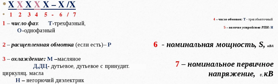 Маркировка силовых трансформаторов содержит 4 блока.