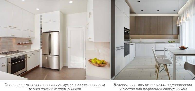 - Необходимость продумывать размещение источников света на потолке еще на этапе ремонта, а размещение встраиваемых в кухонный гарнитур точечных светильников на этапе сборки;