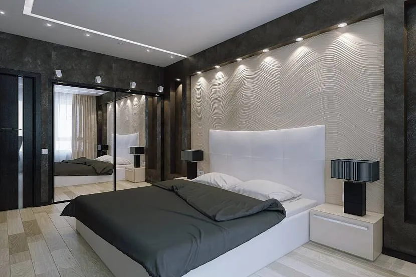 Спальня. Главная задача заключается в том, чтобы создать в спальне мягкую, приглушенную атмосферу. Яркий направленный свет требуется лишь в некоторых местах — у туалетного столика или гардероба. Большая часть источников света направляется на стену, акцентируя ее. При этом часть света отражается обратно в комнату, создавая тот самый необходимый рассеянный свет, настраивающий на полноценный отдых. Любители поваляться на кровати с книгой устанавливают трек-систему над изголовьем, заменяя привычные бра.