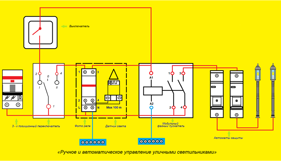 Далее, нужно к ним подвести провода наружного освещения и электропитания. Затем с их помощью собрать схему «Ручное и автоматическое управление уличными светильниками», представленную ниже.
