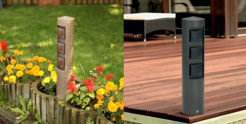 Такая розетка уже более надежна, и способна без замыкания выдержать даже прямое попадание струи воды. Устройство может быть установлено и на стене дома, и на столбах, заборах, в беседке
