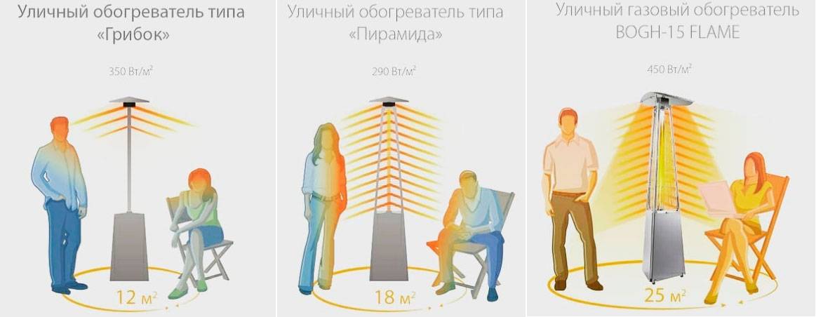 На рынке климатической техники представлено множество уличных обогревателей, отличающихся типом питания, функциональностью и другими параметрами. Для правильного выбора теплового прибора в первую очередь необходимо определить отапливаемую площадь.