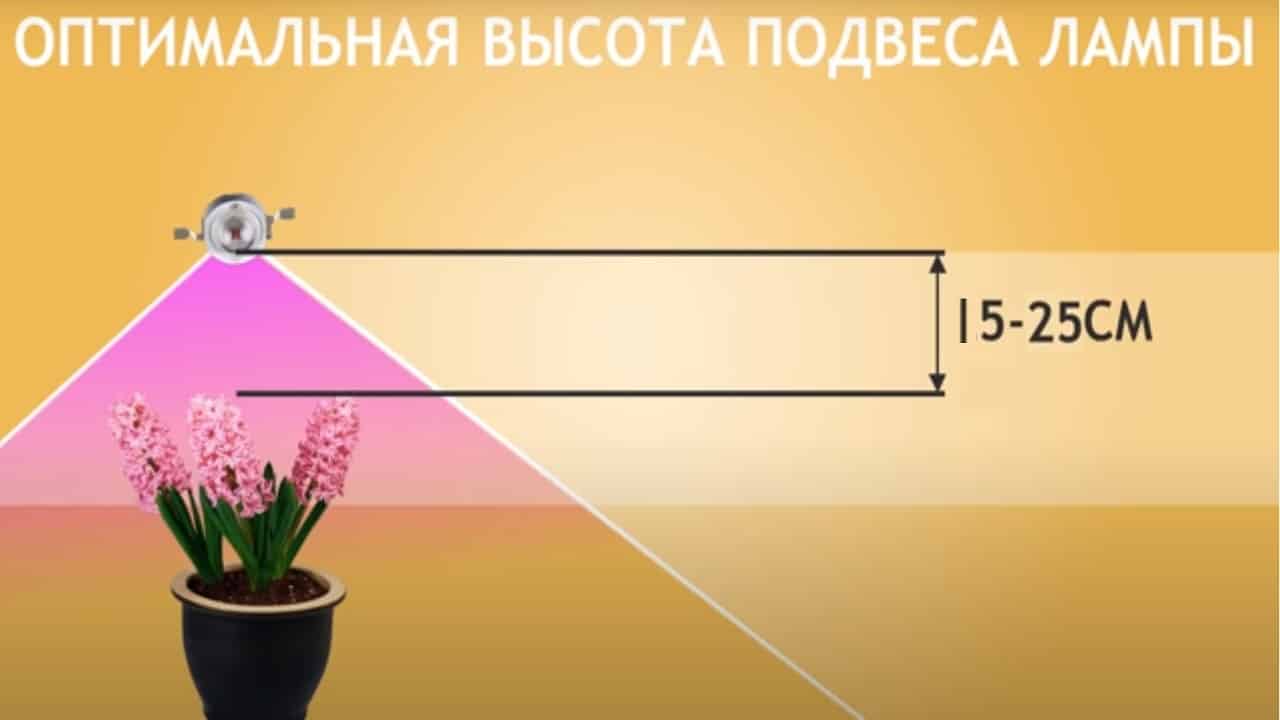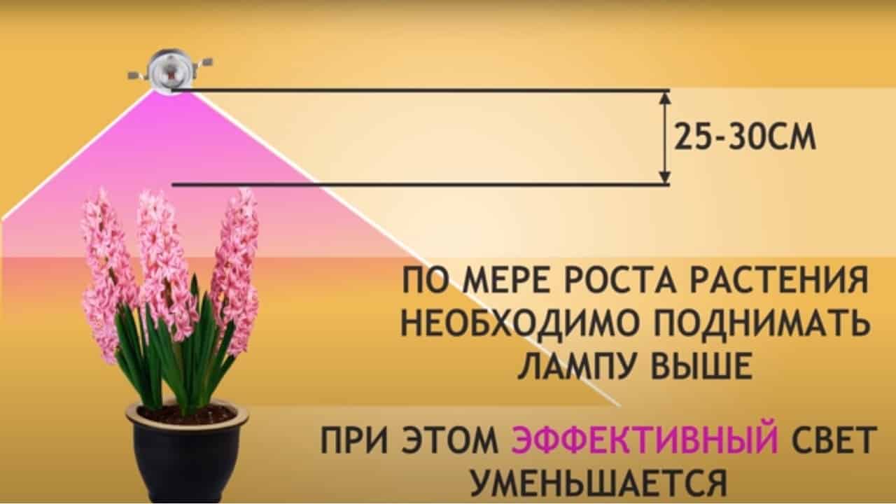 в процессе подрастания, когда крона, побеги и листья растения поднимутся выше зоны охвата лампу нужно будет поднять на 30 – 45 см, чтобы вся культура нормально освещалась;