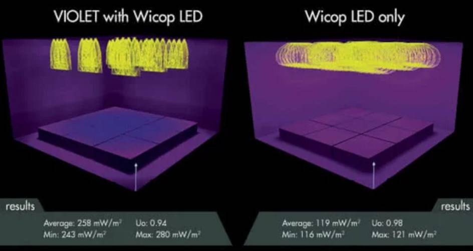 Альтернативой добавлению дополнительных диодов или увеличению мощности является использование дополнительной (вторичной) оптики. Эти элементы коллимируют (фокусируют) излучение, то есть создают направленный луч света равной интенсивности, уменьшая изменения возникающие в результате изменений интенсивности в результате ограниченного угла излучения. Теоретически с коллиматором освещенность на целевой поверхности должна быть равномерной (независимо от расположения светодиода), и заданный уровень излучения может быть достигнут с меньшим количеством светодиодов, поскольку будет потеряна меньше энергии. В качестве альтернативы, более высокая освещенность может быть достигнута с тем же количеством светодиодов по сравнению с версией без вторичной оптики (350 мВт / м2 против 175 мВт / м2).