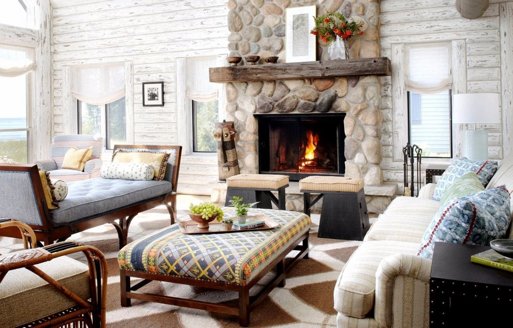 Тяжелый каменный очаг или обрамленный массивной деревянной рамой идеально впишется в традиционную британскую гостиную с роскошными балдахинами и уютными креслами, стоящими напротив огня. Защитный радиус лучше сделать из натурального камня.