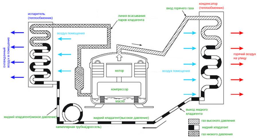 Собственно, принцип действия классической системы кондиционирования здесь не меняется. Также используется хладагент из числа тех марок, что чаще всего применяются на практике. То есть, к примеру, хладагент R410A и подобные хладоны.