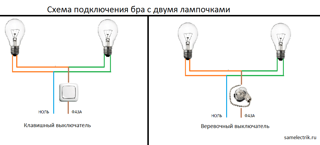 Электрическая схема подключения бра с двумя лампами будет иметь вид: