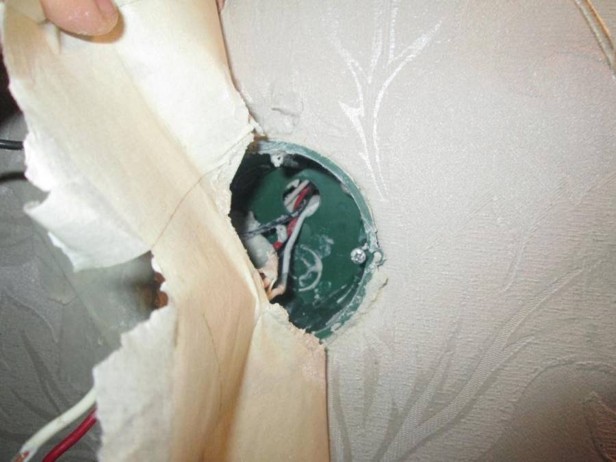После высверливания лунки, необходимо найти нужные провода, которые должны быть прямо за стеной. Бывает что они спрятаны в распаячной коробке, или висят на тросе, с помощью которого провода можно подтянуть к лунке. У каждого мастера есть свой способ по протягиванию проводов в скрытых полостях, но это отдельная история.