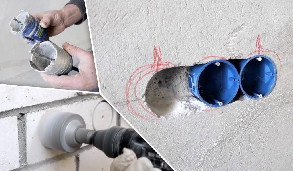 Чтобы установить подрозетник в бетонную стену требуется выполнить отверстие алмазной коронкой, которая устанавливается в патрон перфоратора. Диаметр канала составляет 70-75 мм, глубина отверстия зависит от типа монтажной коробки. С целью снижения затрат на инструмент допускается выполнения отверстия при помощи бура.